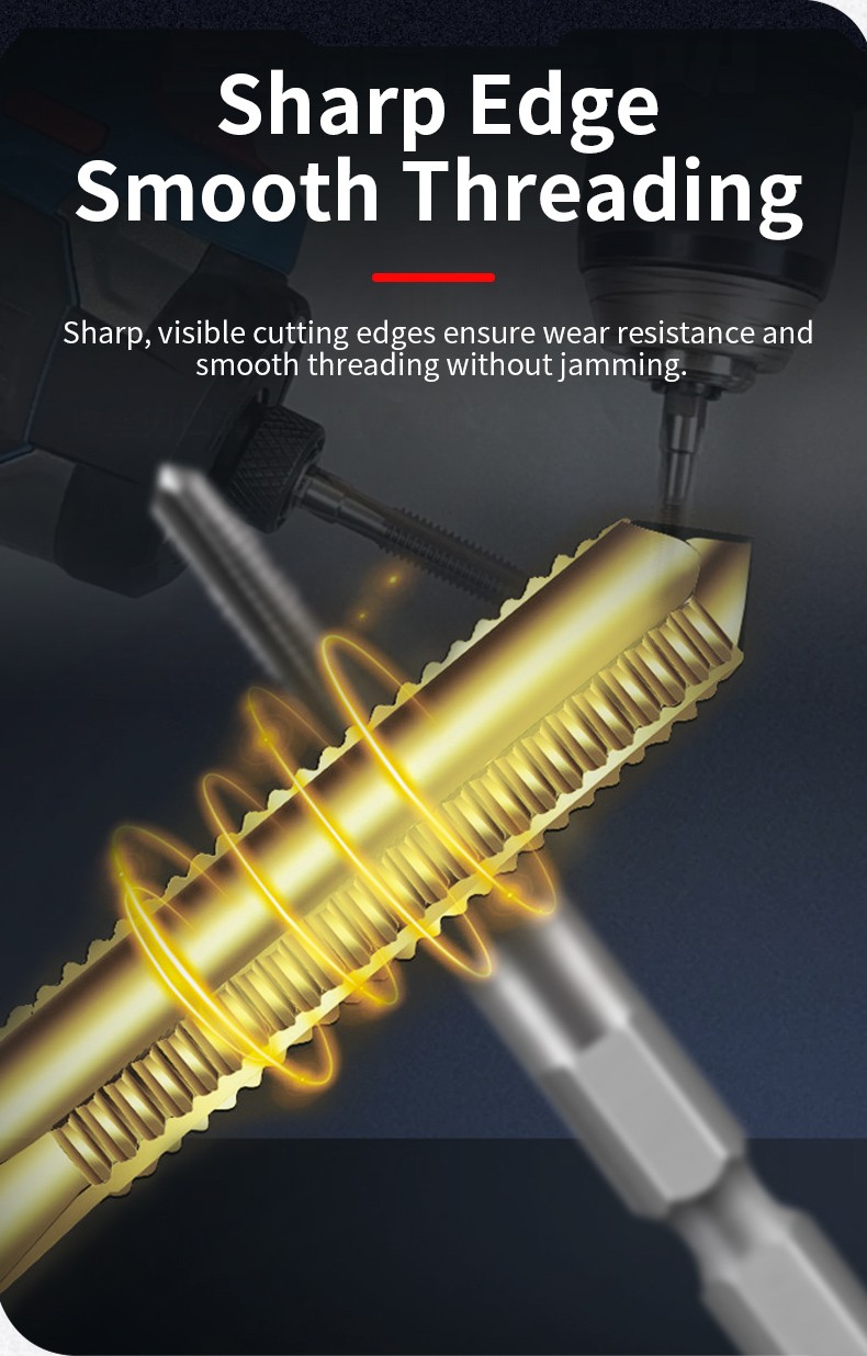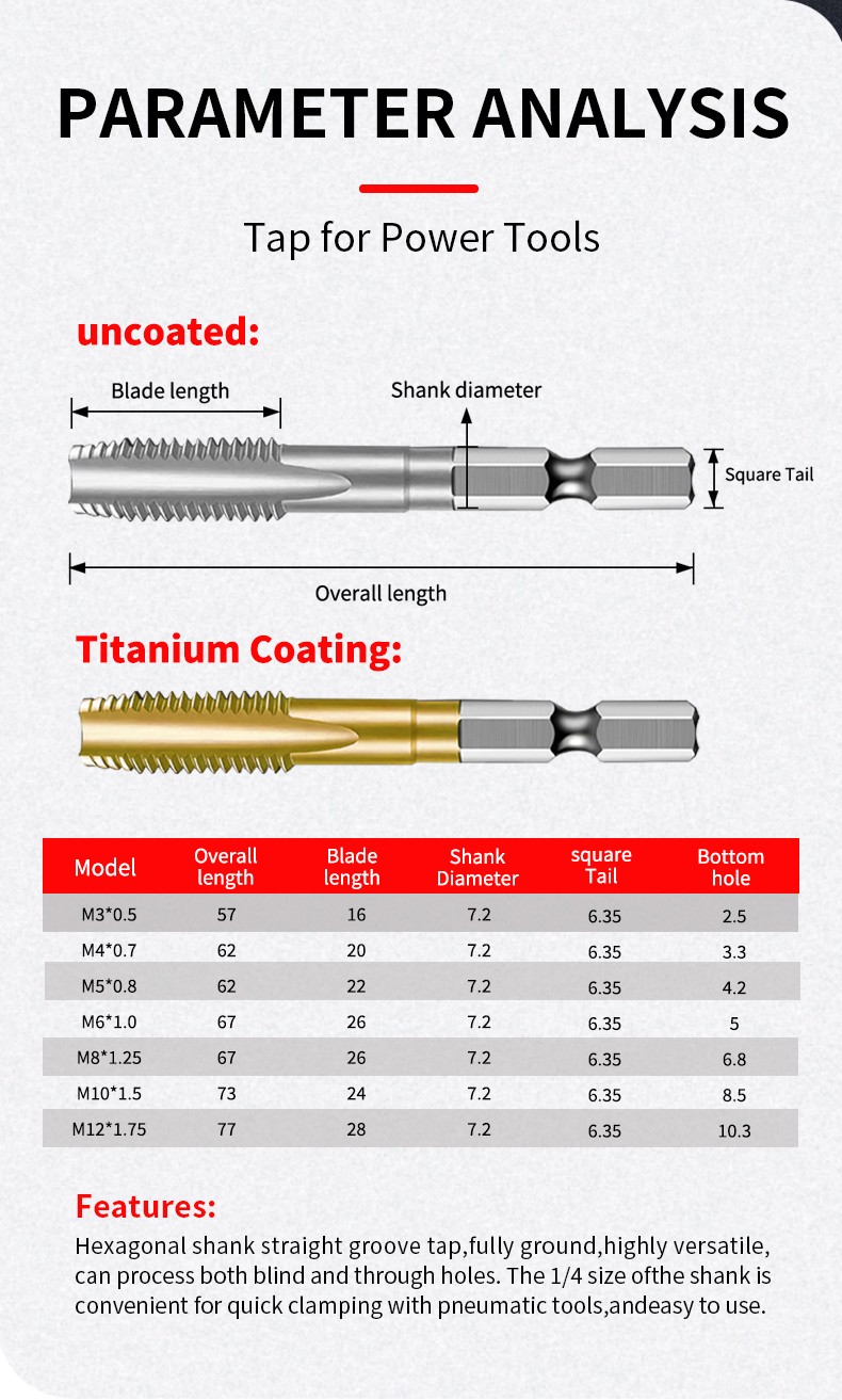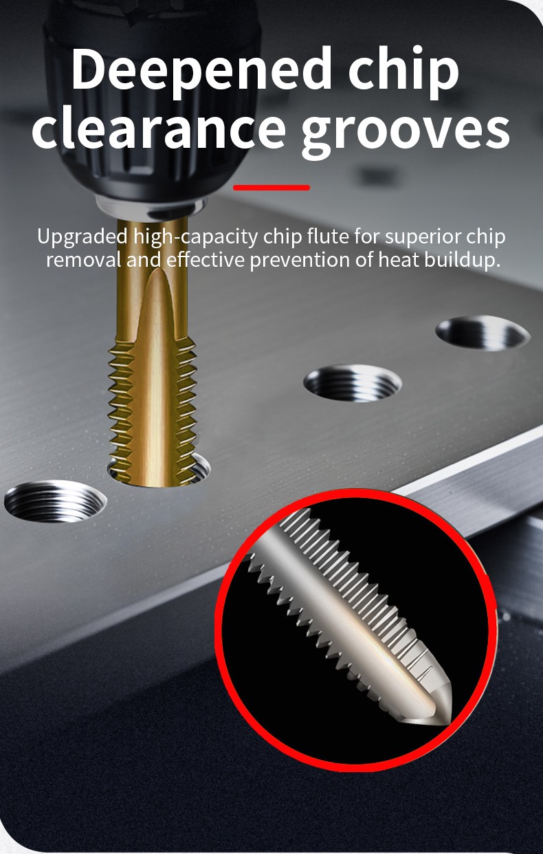특징:범용 디자인을 특징으로 하는 이 탭은 막힌 구멍과 관통 구멍 모두에 적합합니다. 육각형 생크는 공압 공구로 빠르게 고정할 수 있어 편리한 작업을 보장합니다.